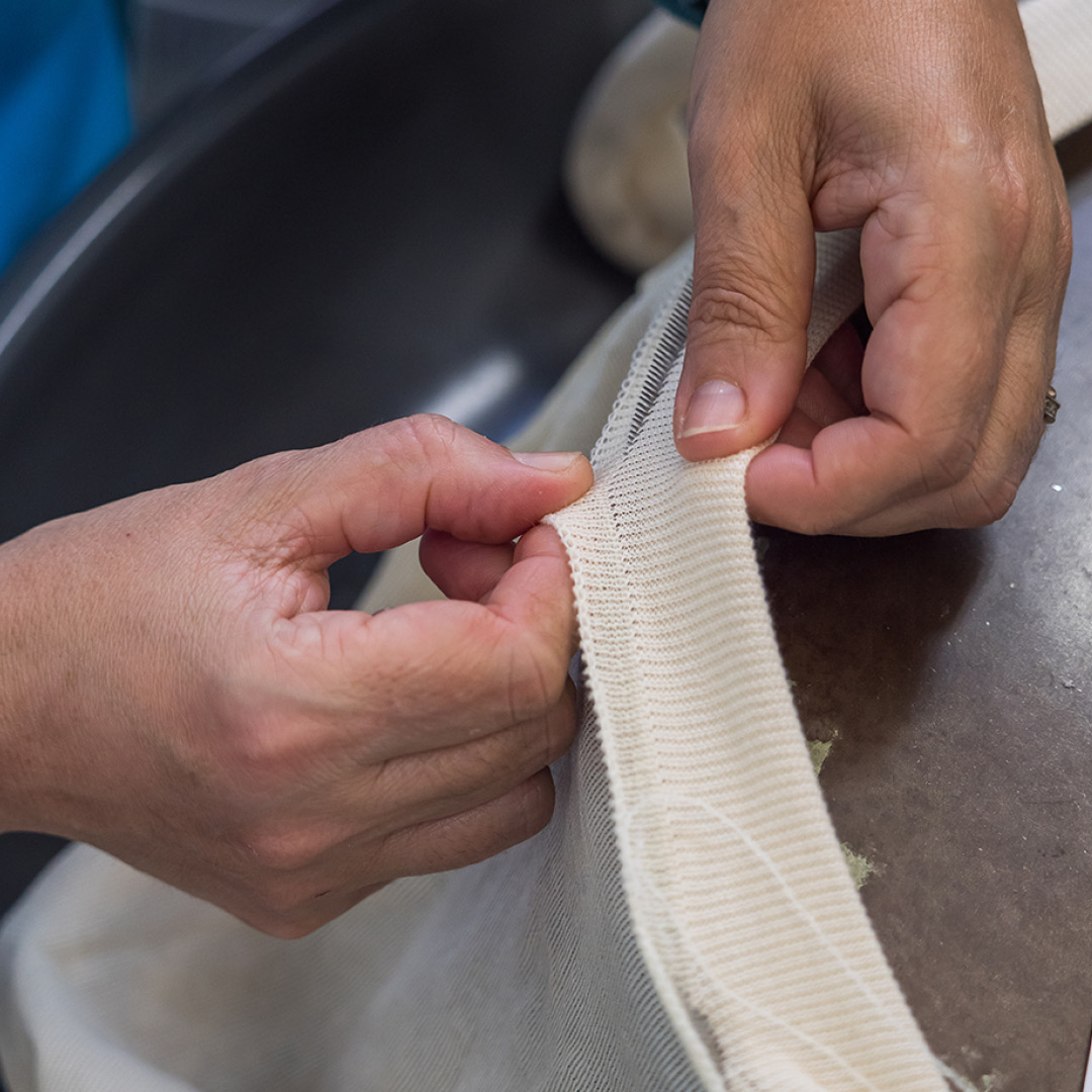 Parce que l'expertise du remaillage à la main s'est perdue au cours des dernières décennies de désindustrialisation en Europe, nous formons depuis deux ans de nouvelles équipes de remailleuses dans notre atelier portugais de Braga afin de faire face à la demande. Ces apprenties, guidées par des ouvrières expérimentées, acquièrent avec le temps ce savoir-faire fondamental dans l'univers de la maille de qualité et nous aident activement à le pérenniser.