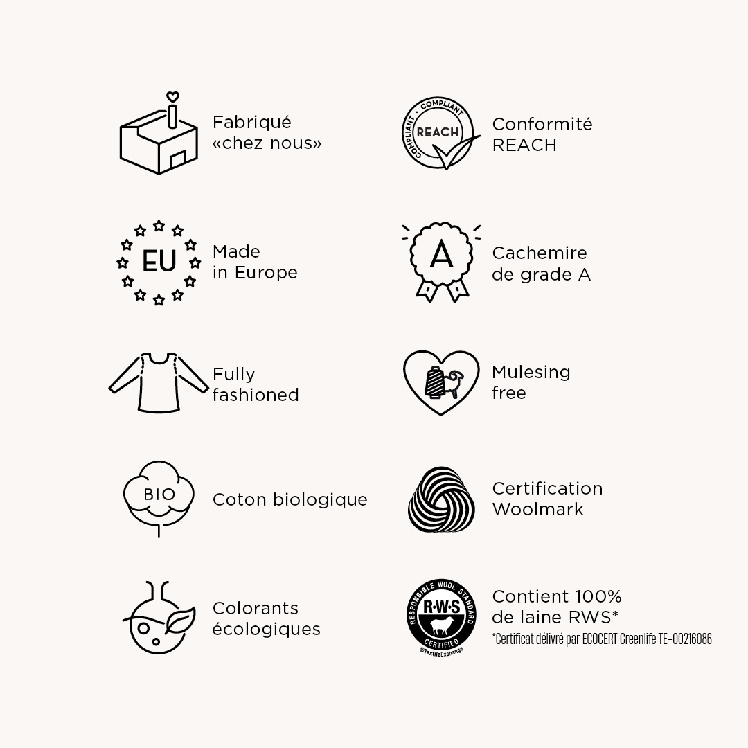 Animés d'une volonté de transparence vis-à-vis de nos clients nous ajoutons depuis l'automne-hiver 2024 sur notre eshop des informations sur les qualités et caractéristiques environnementales des produits qui vont au-delà des exigences de la loi AGEC.
